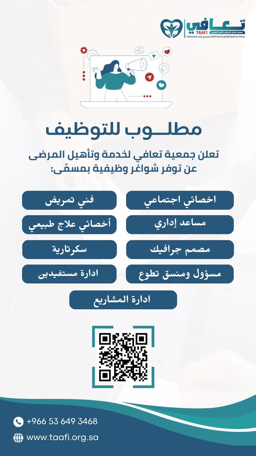 تعلن جمعية تعافي لخدمة وتأهيل المرضى عن توفر شواغر وظيفية