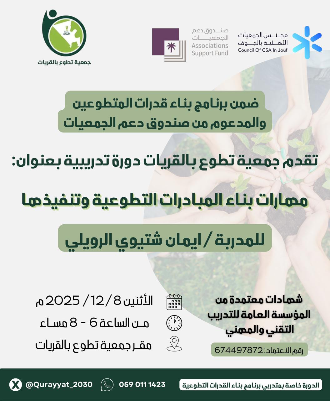 تقدم جمعية تطوع بالقريات دورة تدريبية بعنوان "مهارات بناء المبادرات التطوعية وتنفيذها"
